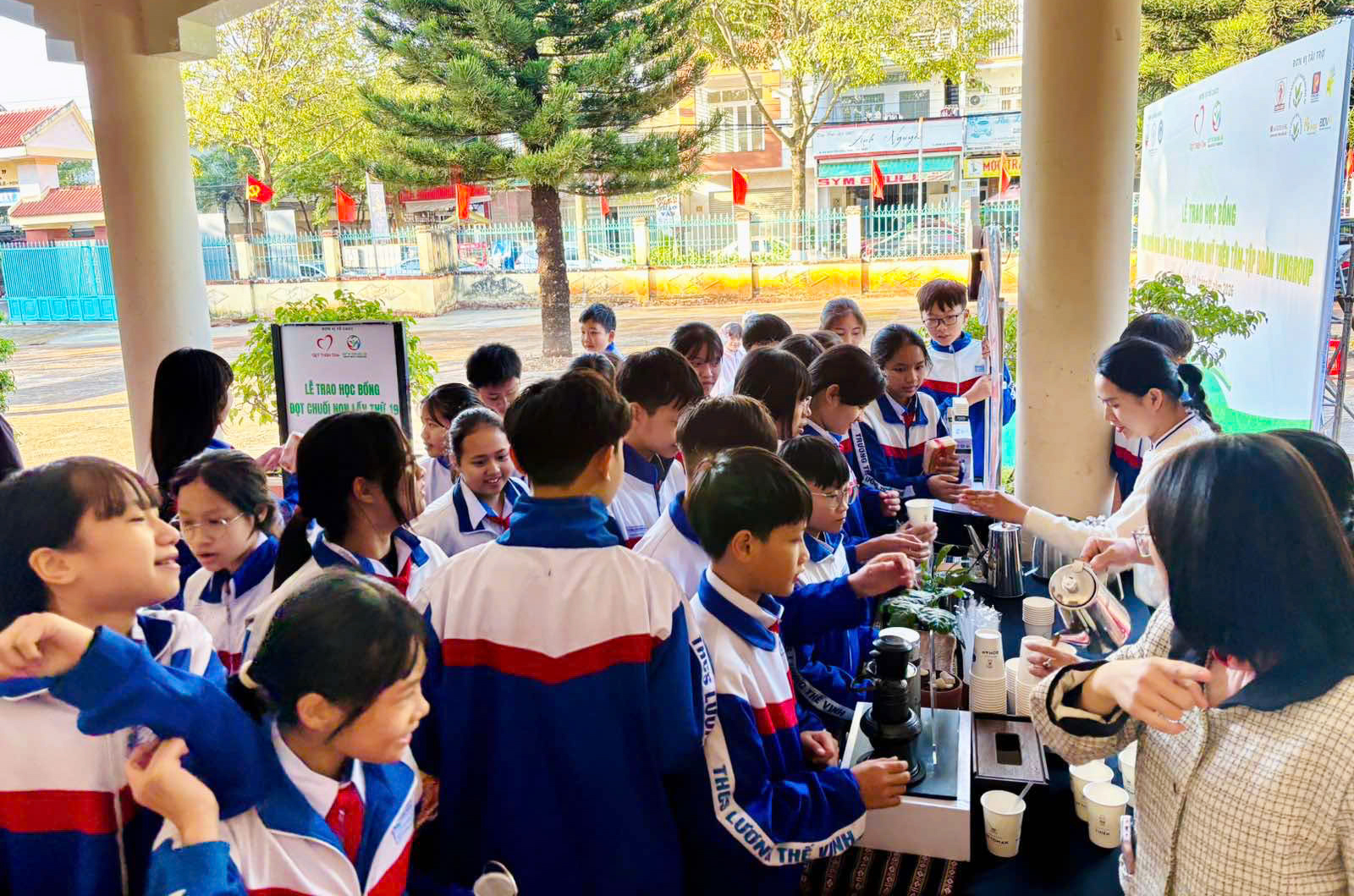 Backdrop Lễ trao học bổng tươi tắn đặt trong sân thu hút nhiều nhóm bạn thay nhau check-in. Tại sảnh trước hội trường, quầy cà phê nóng thơm được các chuyên gia của Tập đoàn Trung nguyên Legend trực tiếp pha chế, cùng những suất bánh ngon thương hiệu Bánh Mì Hà Nội, sữa tươi do Ban tổ chức bố trí đã phục vụ chu đáo mọi người bữa điểm tâm ấm lòng, nhanh gọn.