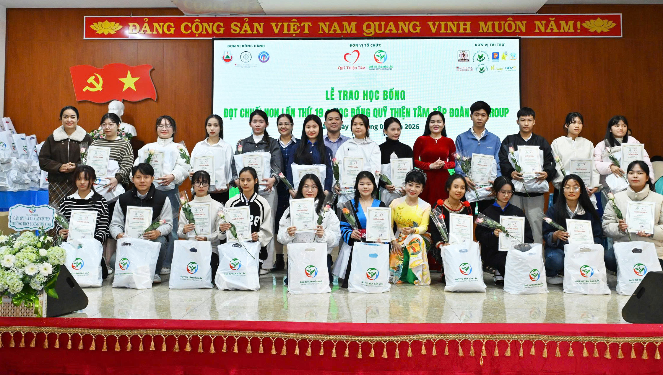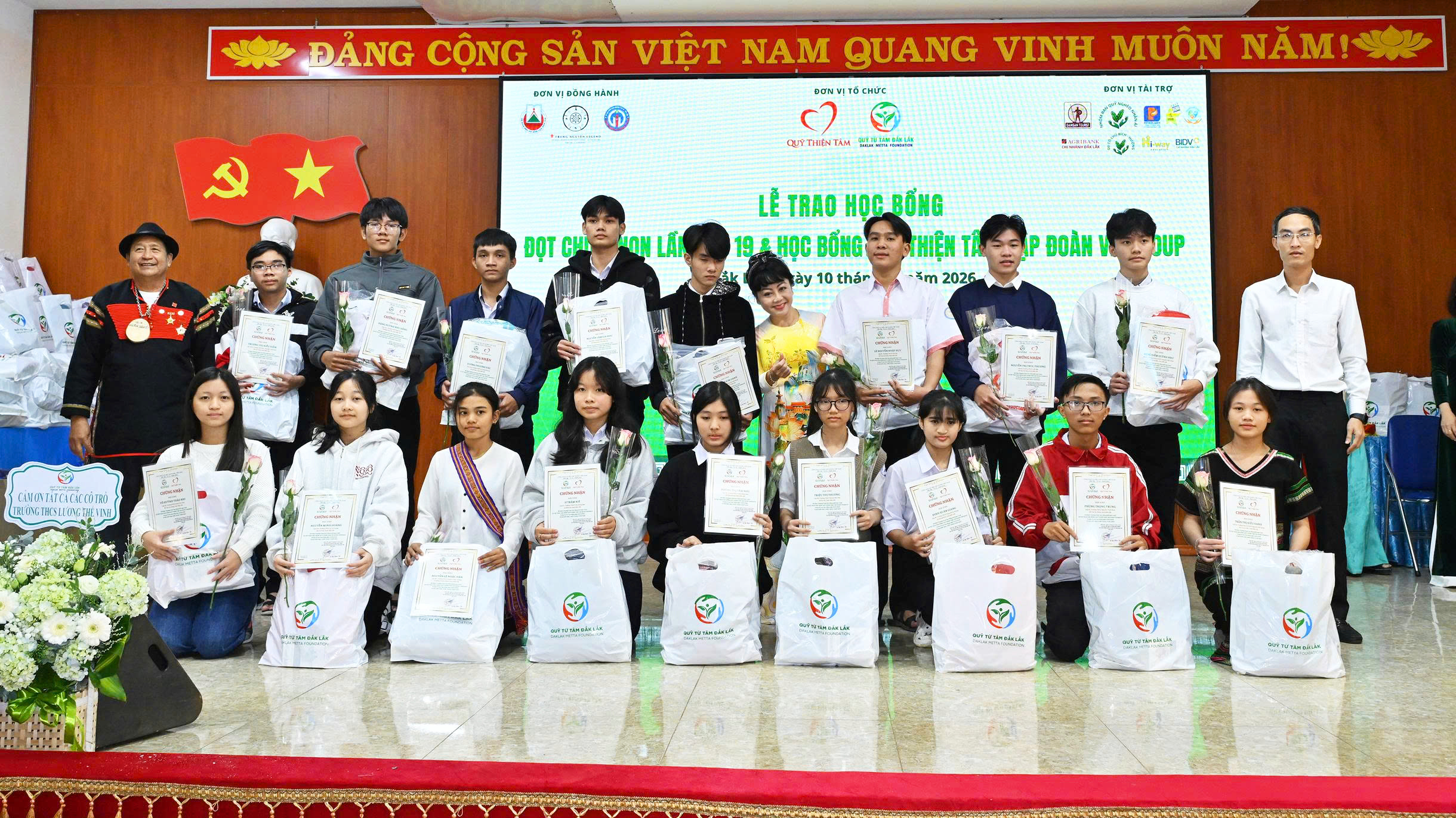 Các nhà tài trợ, các vị lãnh đạo các Sở ngành được mời lên trao học bổng, hoa, quà, giấy chứng nhận cho học sinh-sinh viên